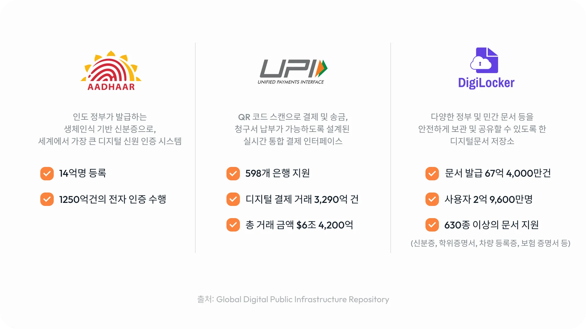 인도의 디지털 대출 시장이 빠르게 성장할 수 있었던 핵심 요인 중 하나는 DPI(Digital Public Infrastructure, 디지털 퍼블릭 인프라)의 발전이다. 인도 정부는 Aadhaar(생체 본인 인증 시스템), UPI(모바일 결제 시스템), Account Aggregator(금융 데이터 공유 시스템) 등의 기술을 기반으로 금융 서비스의 디지털화를 적극적으로 추진해왔다. 이와 같은 디지털 인프라는 대출 승인 절차를 간소화하고, 보다 신속한 금융 거래를 가능하게 했다. 현재 10.5백만 명 이상의 사용자가 Account Aggregator(AA)를 통해 금융 정보를 관리하고 있으며, 이는 금융 기관들이 보다 정교한 신용 평가를 할 수 있도록 돕고 있다.