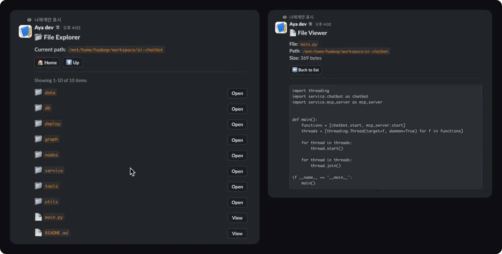 해결: 슬랙 커맨드로 작동하는 파일 탐색기를 구현했습니다. 파일 목록 조회, 내용 보기, 편집, 다운로드까지 가능합니다.