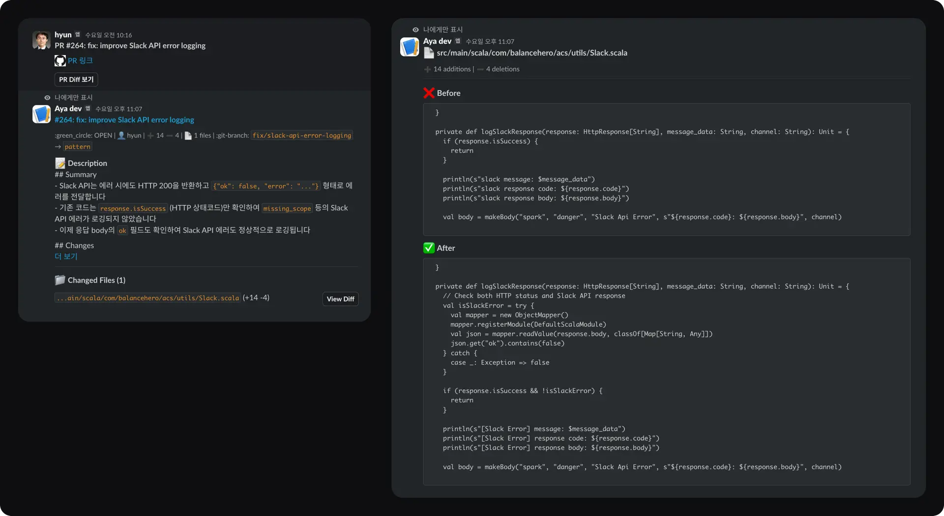 디테일: 'View Diff' 버튼을 통해 변경 전(Before)과 후(After)를 직관적으로 비교할 수 있어, 스마트폰으로도 충분히 코드 리뷰가 가능합니다.