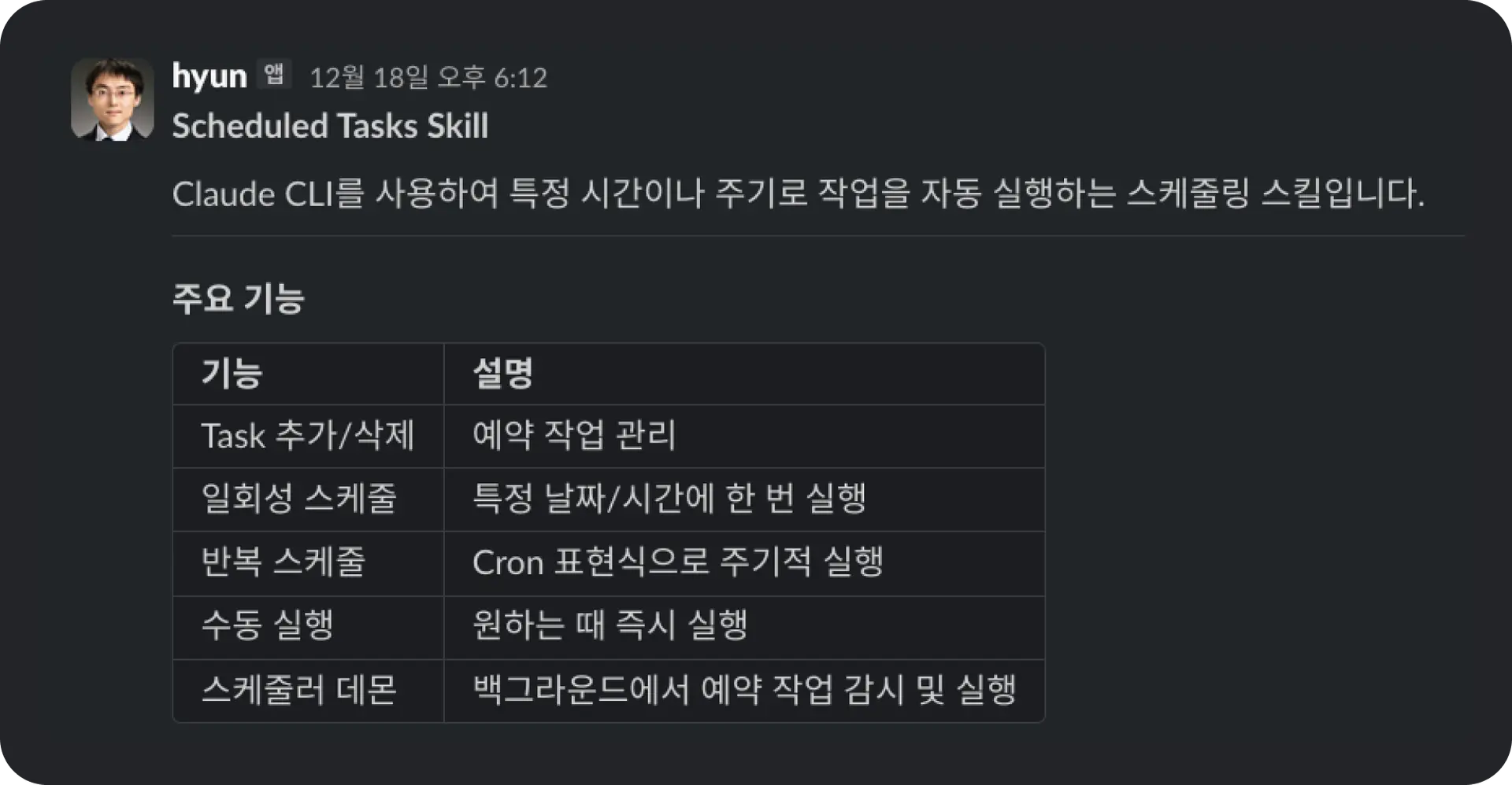 Tip: 이 모든 기능은 제가 직접 코딩한 것이 아닙니다. Claude에게 "이런 기능을 하는 슬랙 커맨드 만들어줘"라고 요청했고, 저는 Slack API 콘솔에서 설정만 추가했습니다.