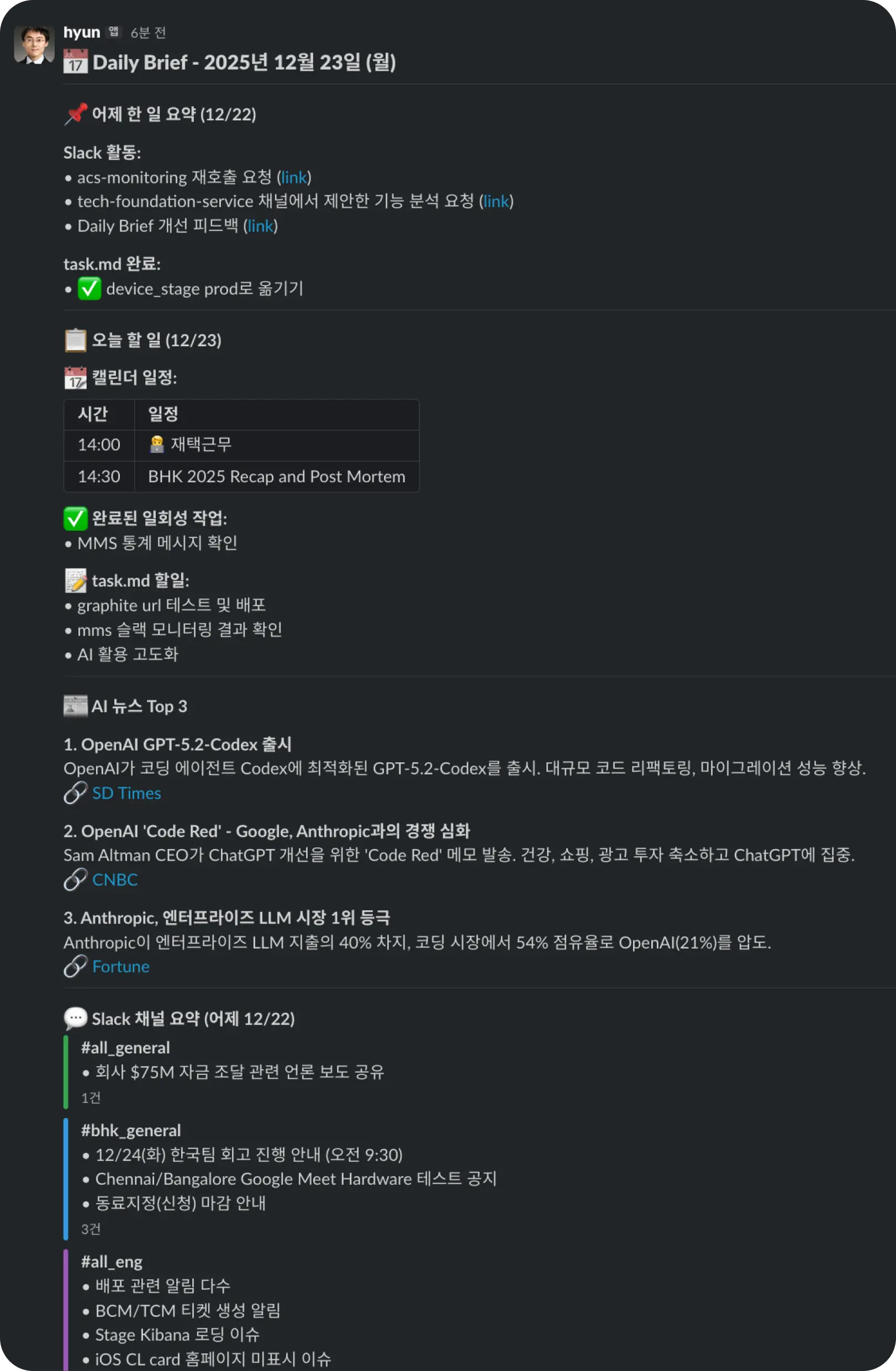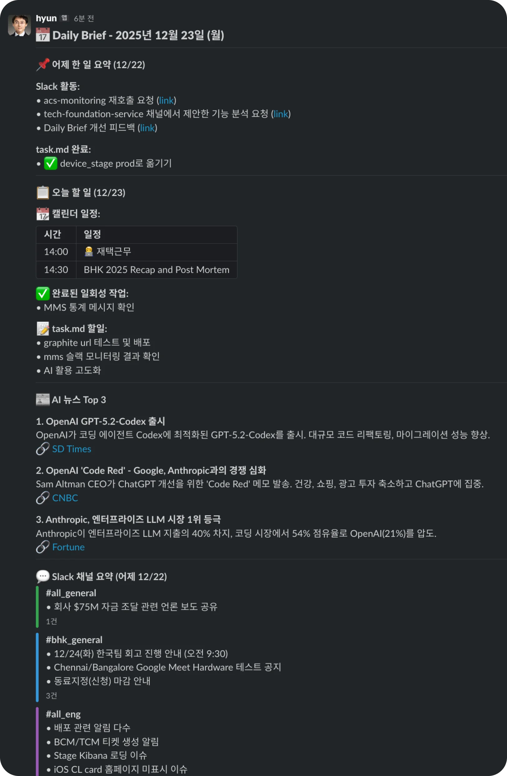 Daily 정리: 슬랙 대화 내용(User Token을 사용하여 DM까지 포함)과 AI 작업 로그(Tasks 폴더)를 병합하여 그날의 업무를 정리합니다.