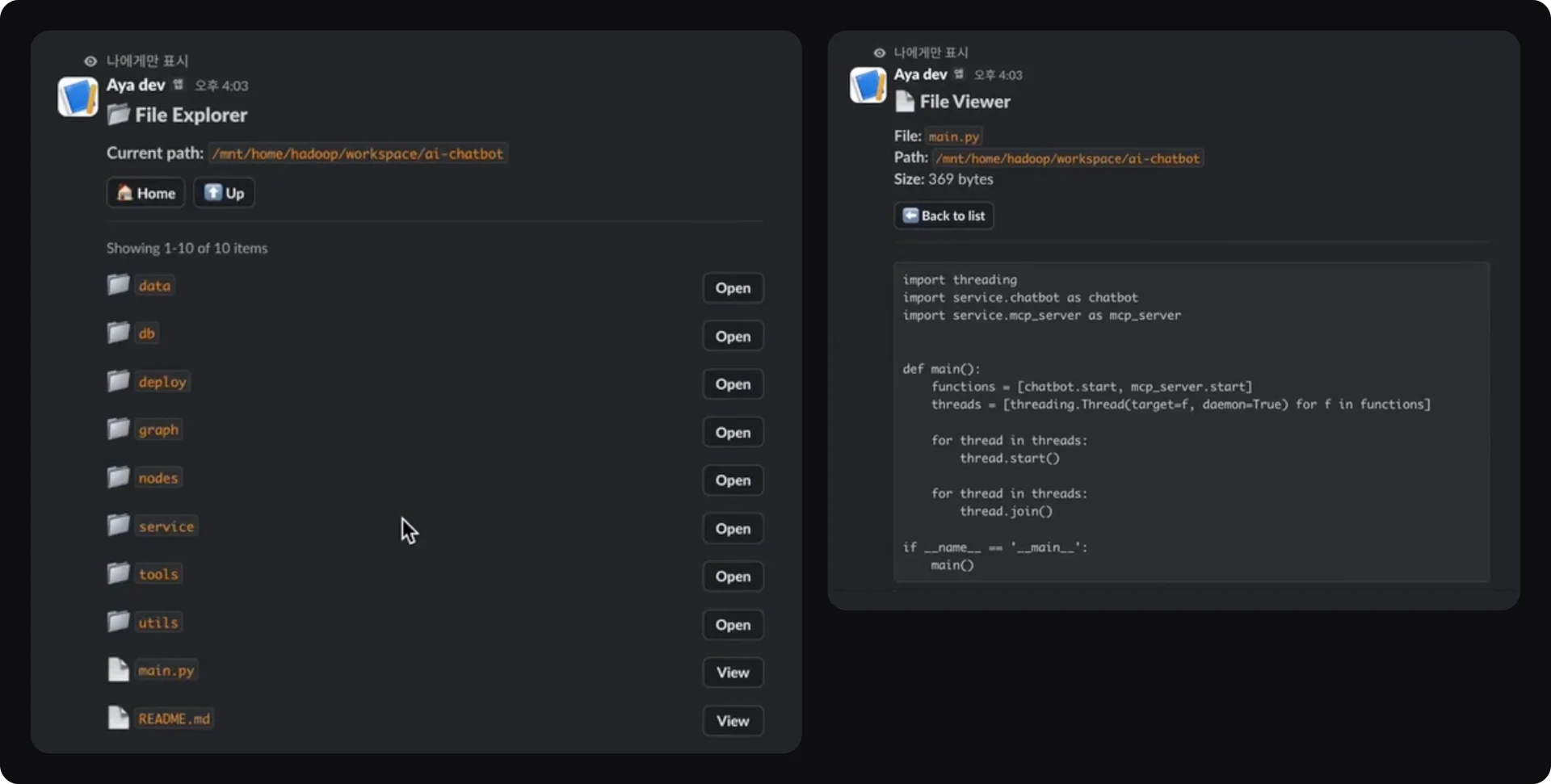 디테일: 텍스트가 긴 파일은 페이징(Paging) 처리를 통해 슬랙 메시지 길이 제한을 우회했습니다.