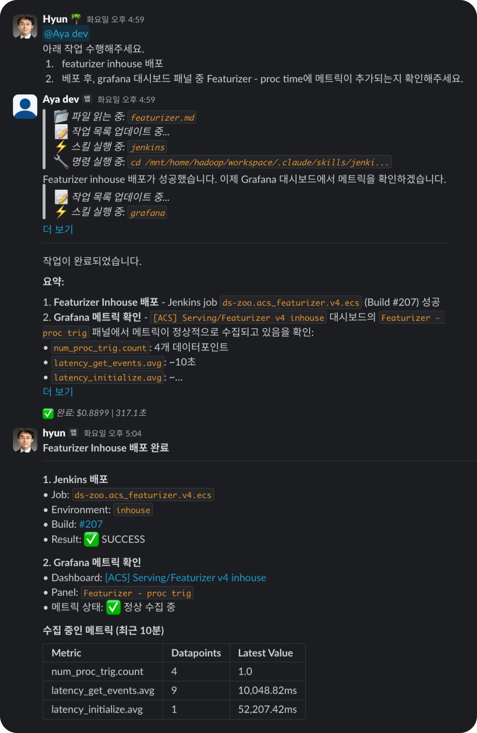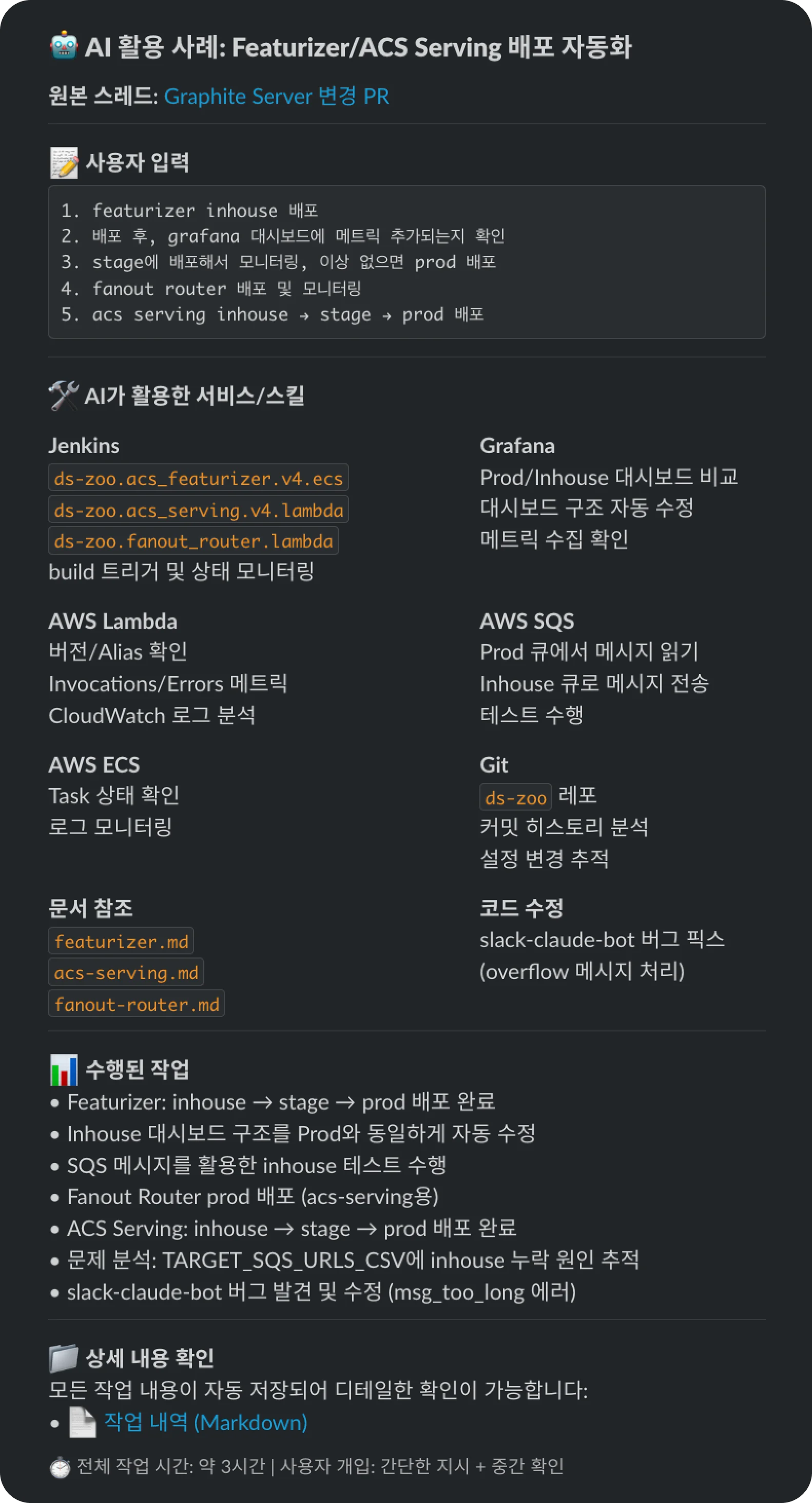 [AI의 활약] 슬랙에서 간단히 "ACS 서비스 수정사항 배포하고 모니터링해줘"라고 요청했습니다. AI는 해당 프로젝트의 지침 문서(Instruction)를 참조하여 다음 과정을 스스로 수행했습니다.