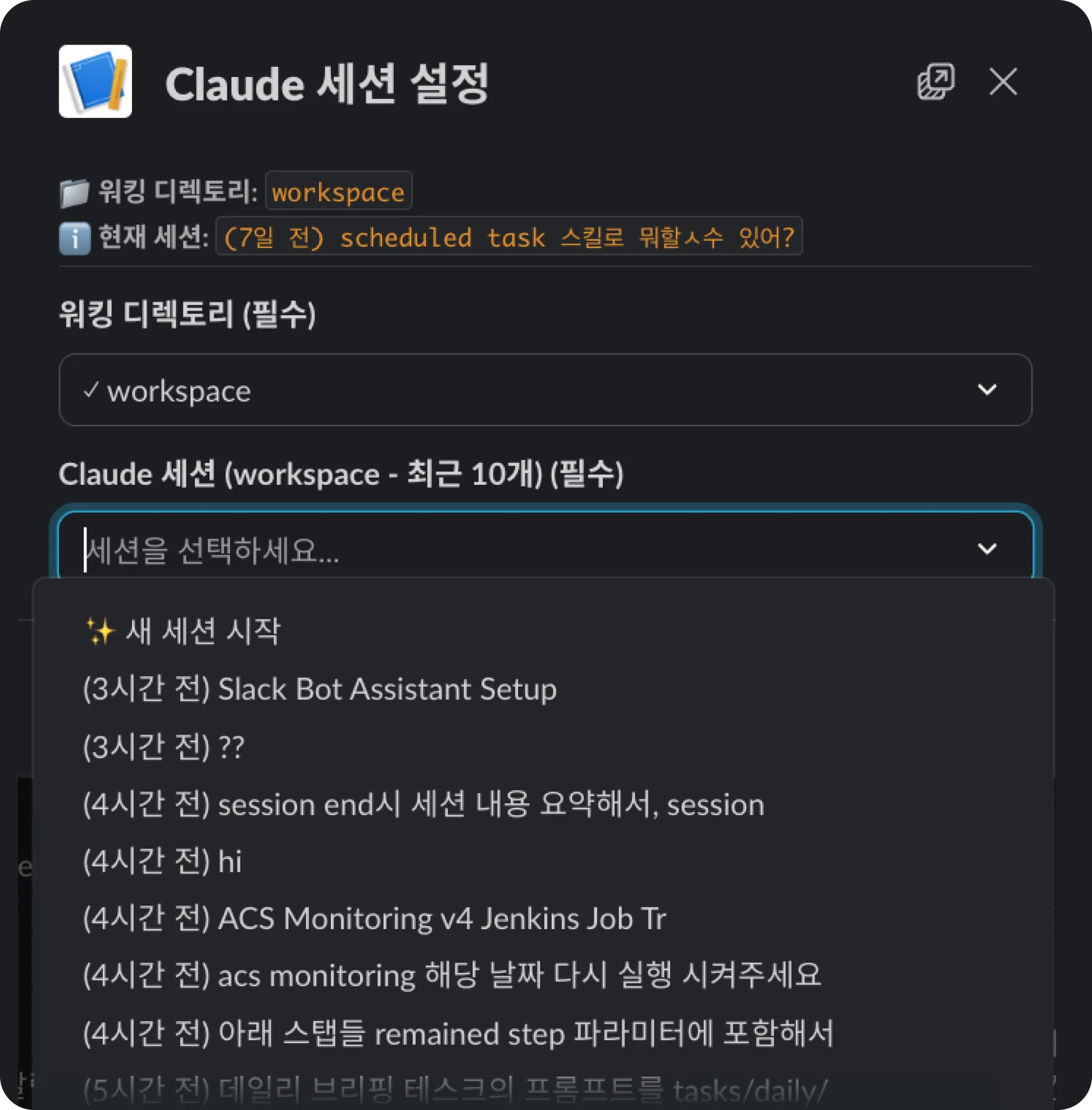 유연한 연결: VS Code에서 작업하다가 퇴근길에 슬랙을 켜면, Session 선택 팝업을 통해 기존 작업을 그대로 이어갈 수 있습니다. 반대로 슬랙에서 하던 대화를 PC에서 이어받을 수도 있습니다.