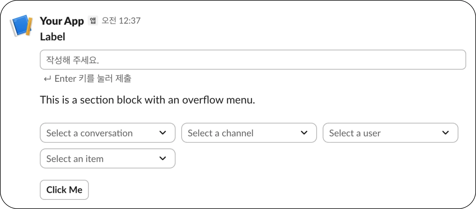 단순 텍스트 대화만으로는 복잡한 정보를 파악하기 어렵습니다. Slack의 기능을 십분 활용해 사용자 경험(UX)을 개선했습니다.
