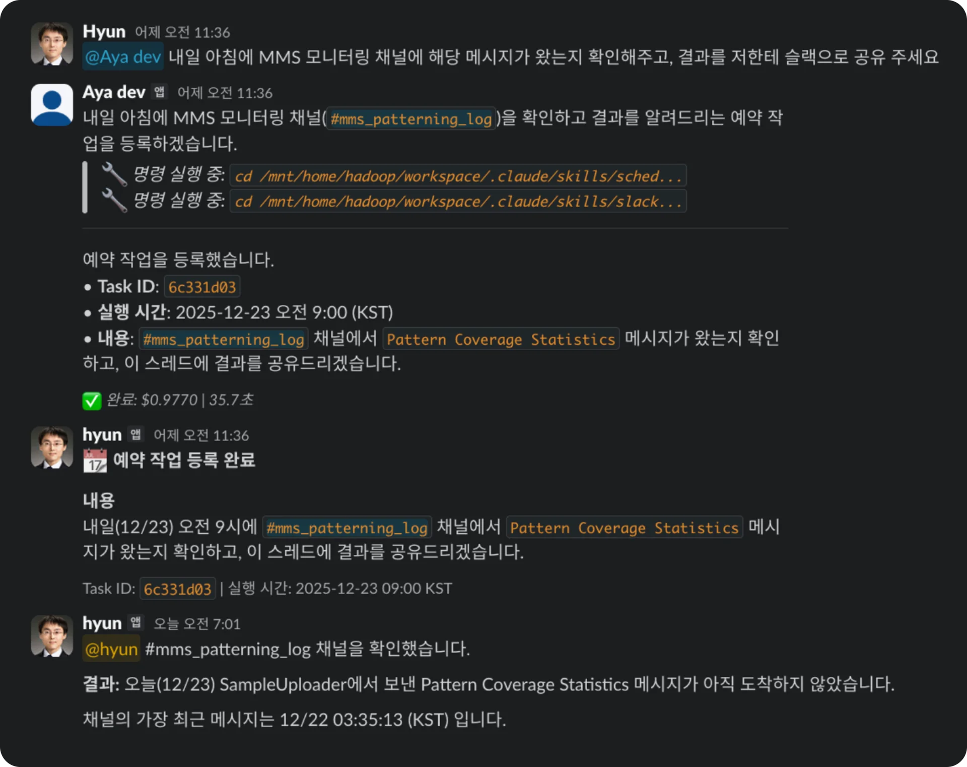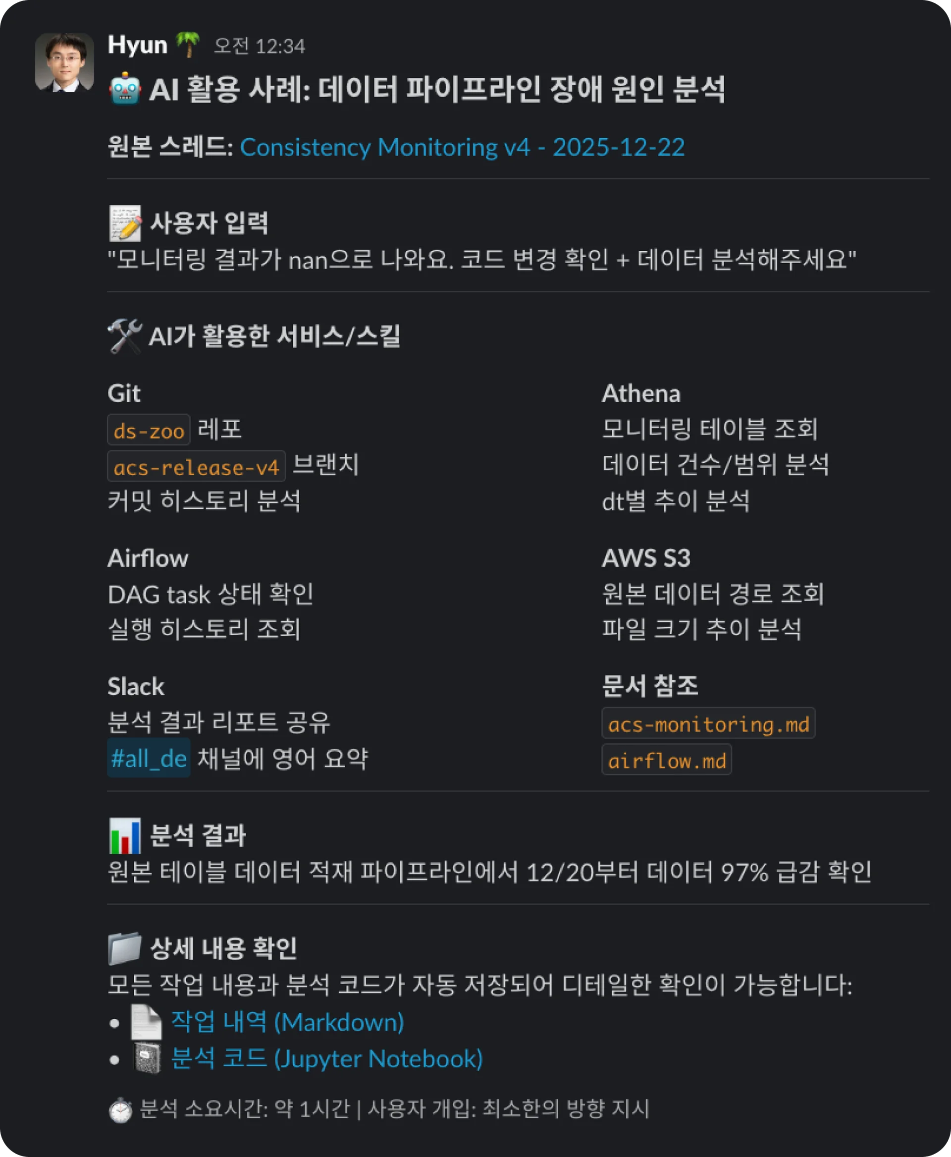 [AI의 활약] 침대에 누워 슬랙으로 "모니터링 결과가 이상한데 분석해줘"라고 던졌습니다. AI에게 준 힌트는 "이 결과는 notification.py에서 처리된다"는 프로젝트 문서의 한 줄뿐이었습니다.