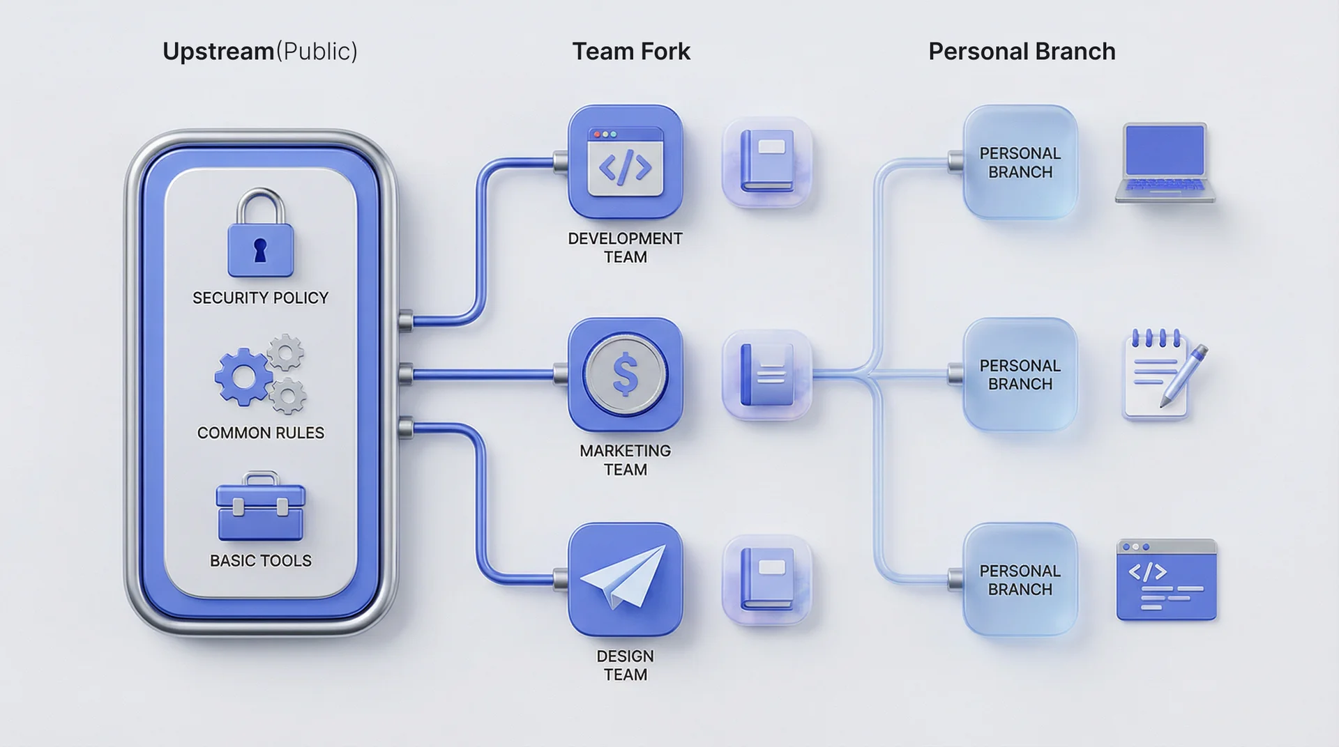 공용 작업 공간 (Upstream): 전사적으로 공통된 룰, 보안 정책, 기본 도구(Base Tools)가 세팅된 최상위 공간입니다. 전사에 공통으로 필요한 내용만 최소화해서 적용 합니다.