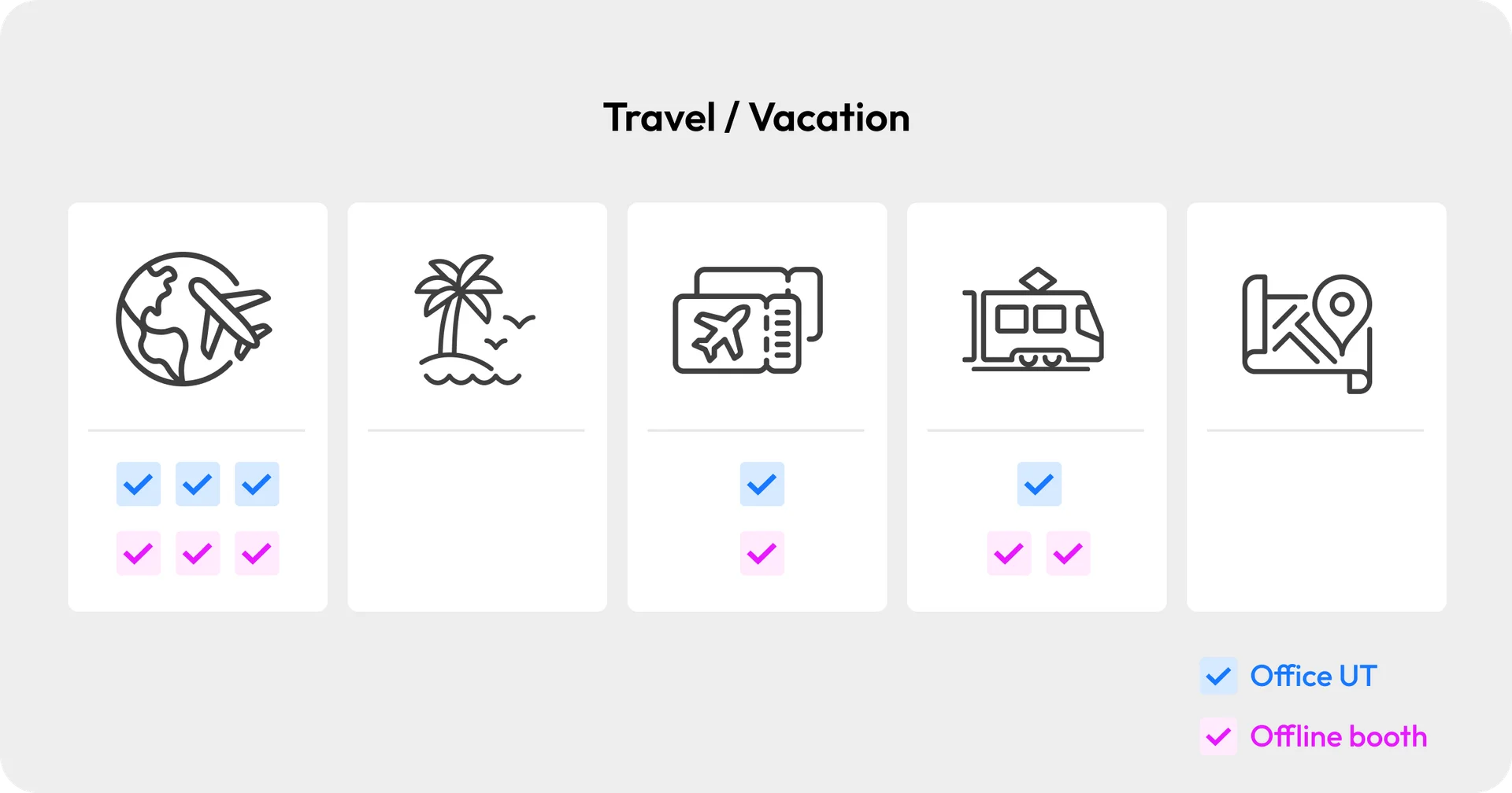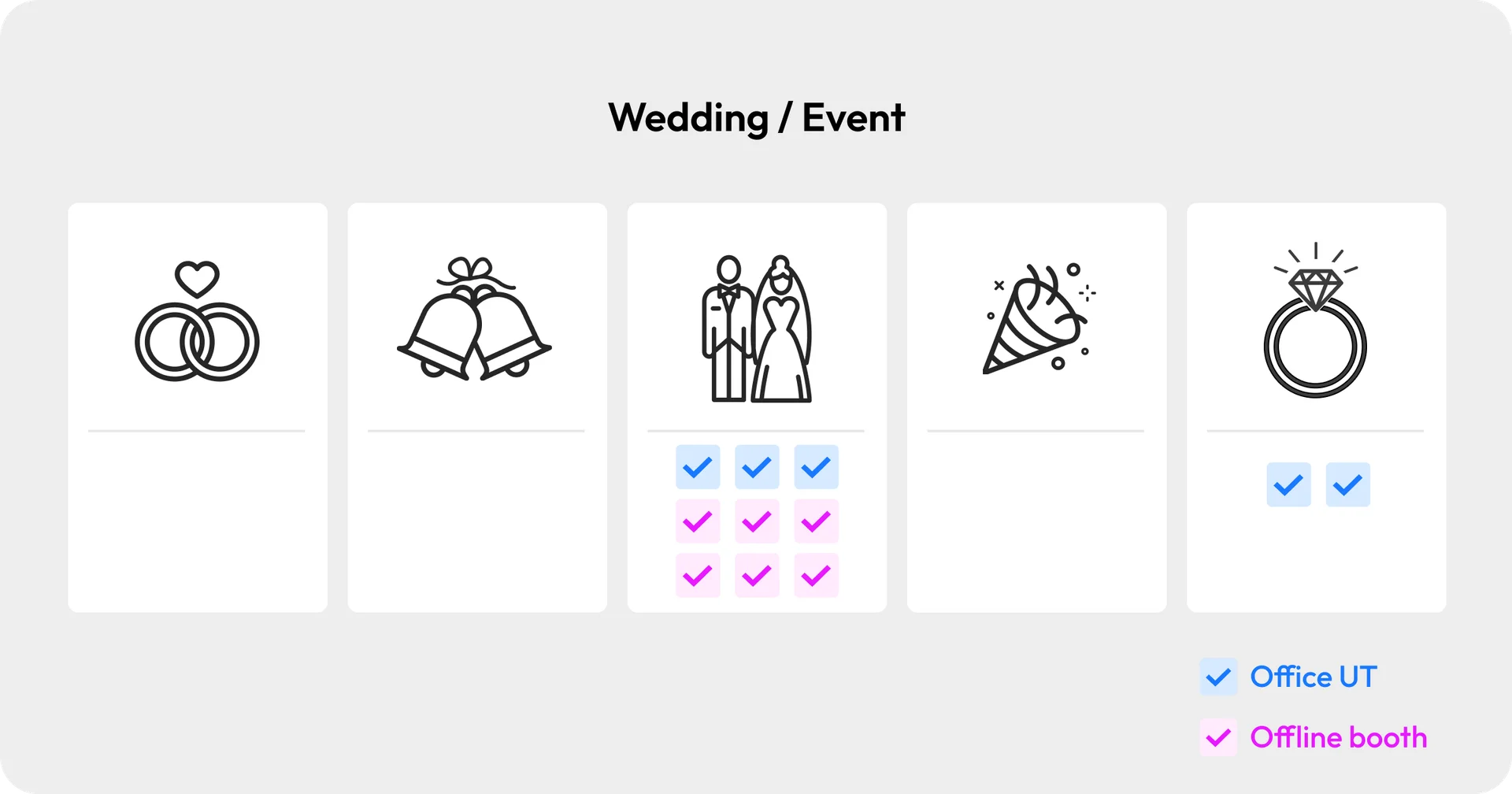 우리 고객들은 아이콘 중에서도 의미가 직관적으로 와닿는 아이콘을 선호했습니다 가령, 결혼을 ‘상징’하는 결혼반지보다는 신랑과 신부가 예복을 입고 나란히 서있는 아이콘을 ‘Wedding/Event’이라는 목적과 더 쉽게 연결하였습니다. 또한 ‘여행’은 휴식을 추상적으로 상징하는 야자수나 지도보다는, 멀리있는 고향에 갈때 타는 국내선 비행기나 인도에서 핵심적인 장거리 교통수단인 기차로 구성된 직관적인 아이콘을 더 선호했습니다.