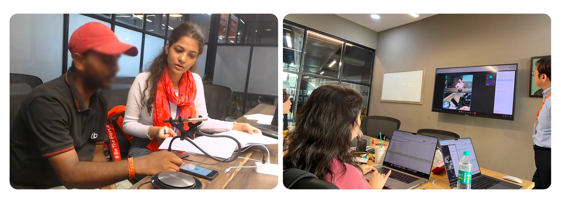 이후 오피스에서 여섯명의 고객을 대상으로 사용성 테스트(Usability test)를 실시했습니다. 인도 방문 전에는 한국에서 유저 리서처와 함께 궁금했던 내용을 질문지로 준비했고, 현지 언어에 능통한 모더레이터의 지원을 받아 테스트를 수행했습니다. 테스트 환경에 너무 많은 관찰자가 참여할 경우 고객이 갖게될 심리적 부담을 고려해서 모더레이터와 유저리서처 외의 관찰자들은 따로 Observation room에 모여 고객이 프로덕트를 어떻게 사용하는지 관찰하였습니다. 카메라와 거치대를 설치하여 고객의 표정 및 손으로 앱 화면을 사용하는 모습을 송출하고 각자의 관찰점과 인사이트를 스프레드 시트에 작성하여 의견을 공유하는 방식을 채택했습니다.
