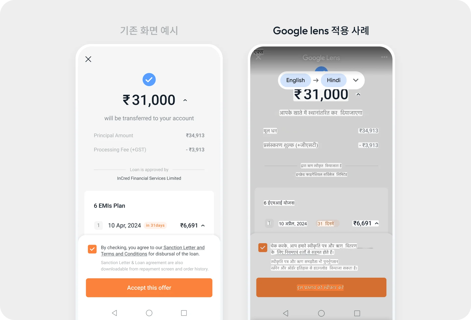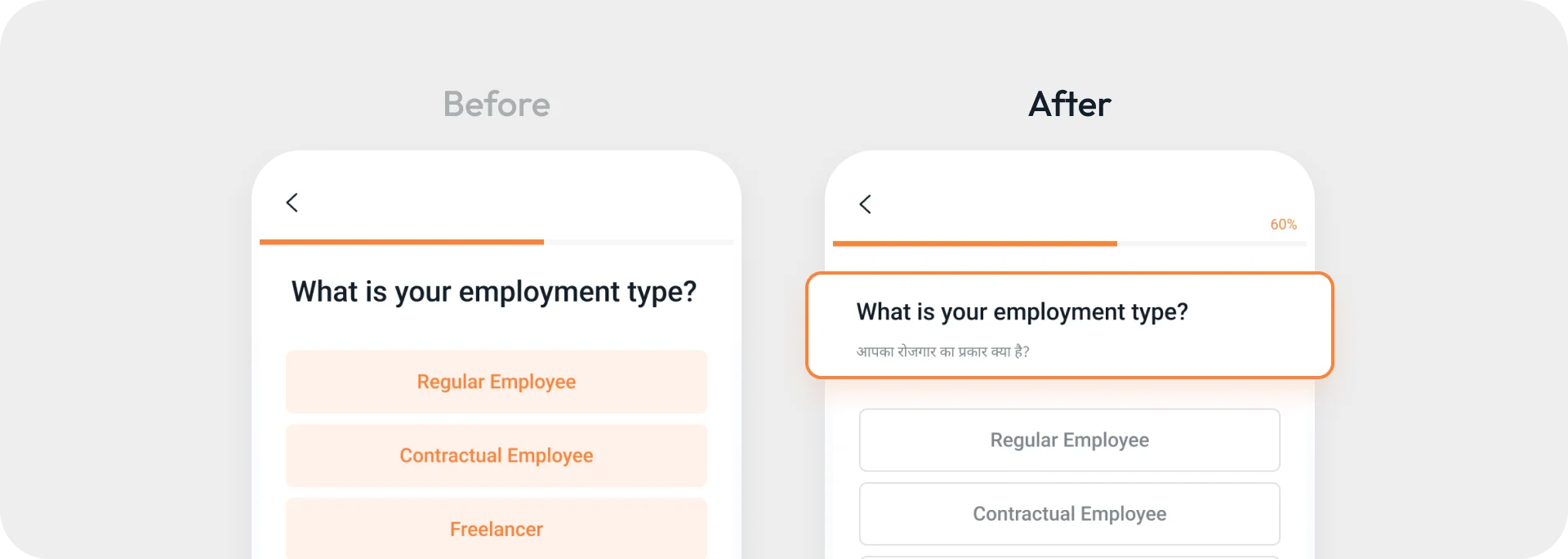 힌디어가 영어보다 편하지만 앱서비스를 사용할때는 영어를 사용한다는 점, 그와 동시에 영어가 고객에게 언어의 장벽이 될 수 있다는 점을 고려해서 우리는 질문내용에 영어 및 힌디어를 병기하여 제공하는 아이디어를 얻을 수 있었습니다.