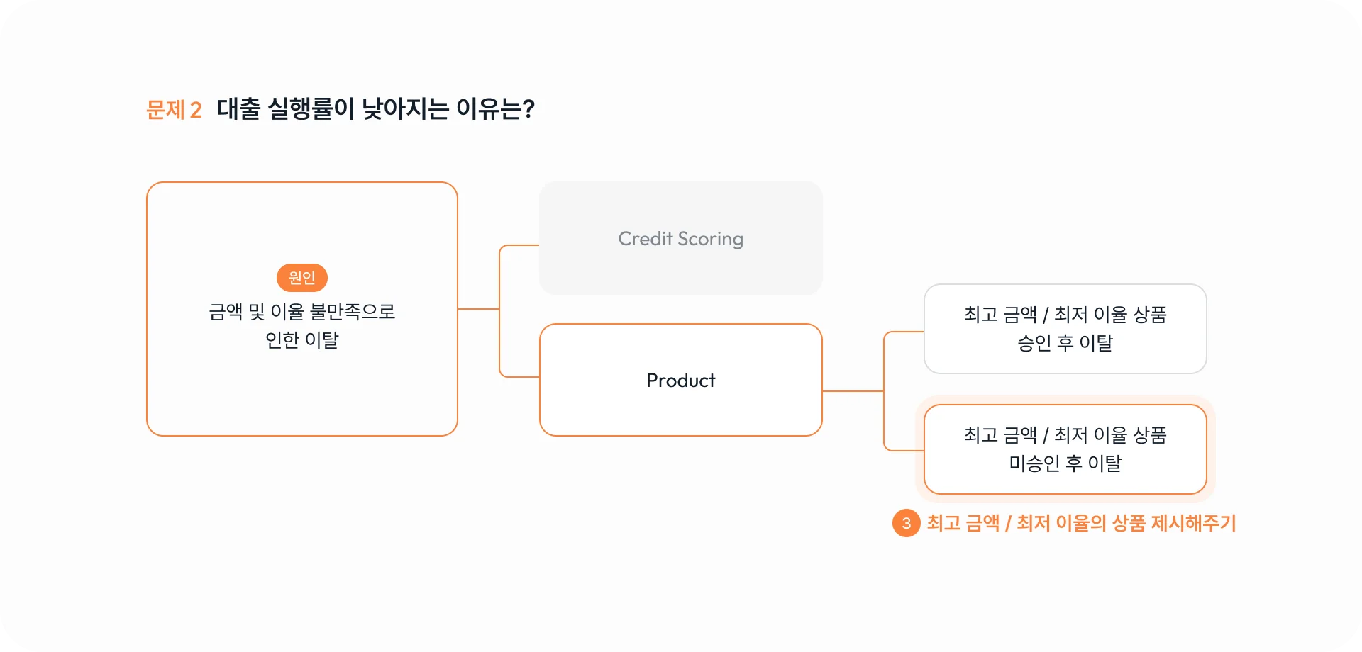 대출 실행율 저하에 영향을 미치는 요인으로, 유저 리서치 결과 대부분의 유저가 금액과 이자율에 불만을 느끼고 있었습니다. 즉, 대출이 승인되었음에도 대출 승인 금액과 이자율 등 대출 조건에 대한 불만족이 실행을 저해하는 주요 요인으로 나타났습니다.