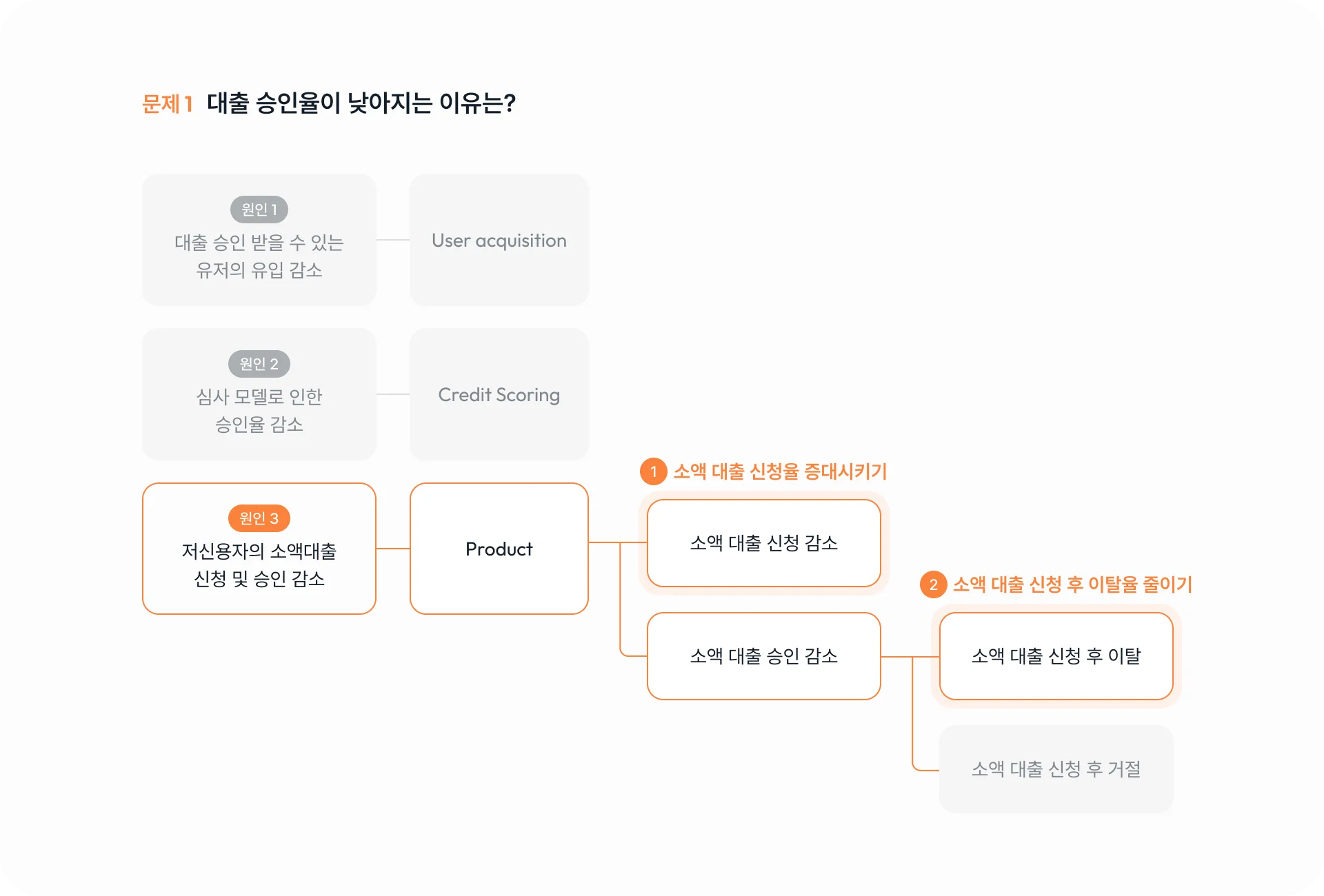 이러한 문제 의식에 따라 대출 승인율과 대출 실행율의 문제를 다음과 같이 분류했습니다. 승인율과 실행율에 영향을 미치는 요인을 리스트업하고, 프로덕트 팀에서 집중해야 할 세부 문제를 정의했습니다.