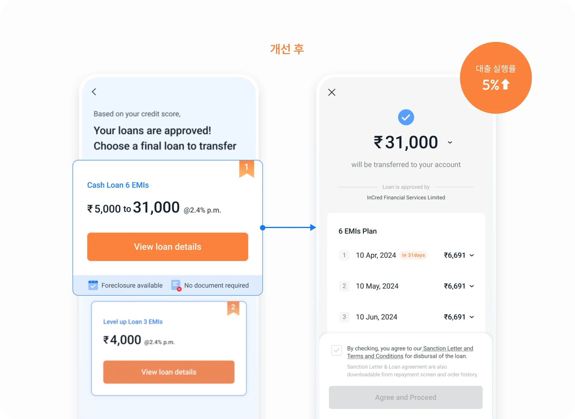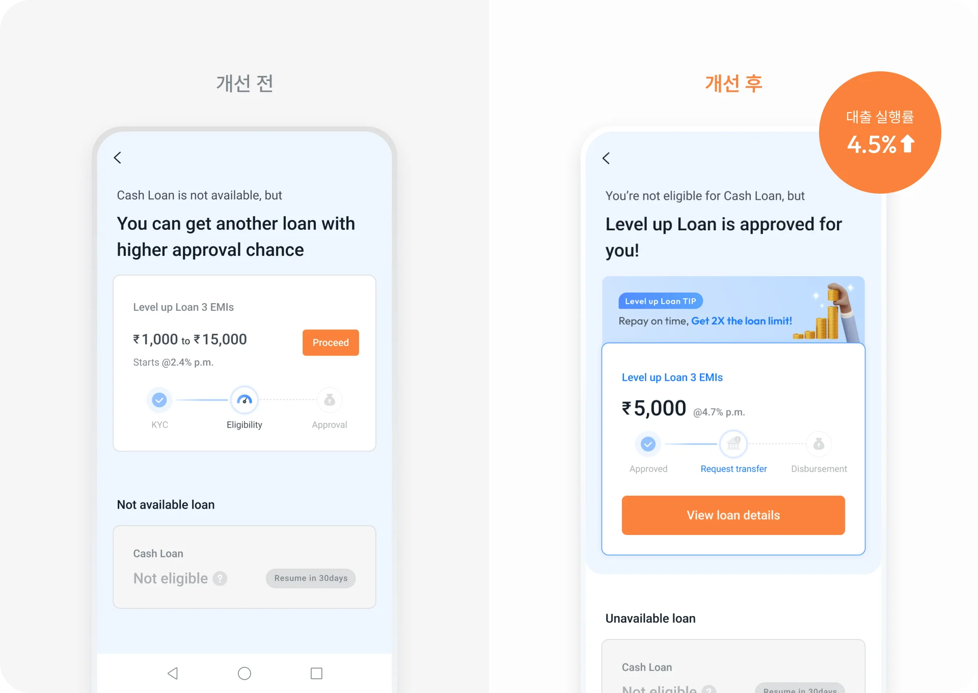해당 실험을 진행하며, 목표했던 것은 Cash Loan에서 거절되었지만 Levelup Loan 승인 가능 유저의 전환율을 증진시키는 것이었습니다. 때문에 화면을 개편하며 유저에게 즉시 승인되었다는 정보, 승인 후 추가적인 심사 과정 없이 승인 가능하다는 정보를 알려주는데 방점을 두었습니다. 이를 통해 전반적인 대출의 승인 및 실행을 높임으로 전사의 KPI를 달성할 수 있다고 생각했기 때문입니다. 그 결과 해당 유저의 대출 전환율이 4.5% 증가할 수 있었습니다.