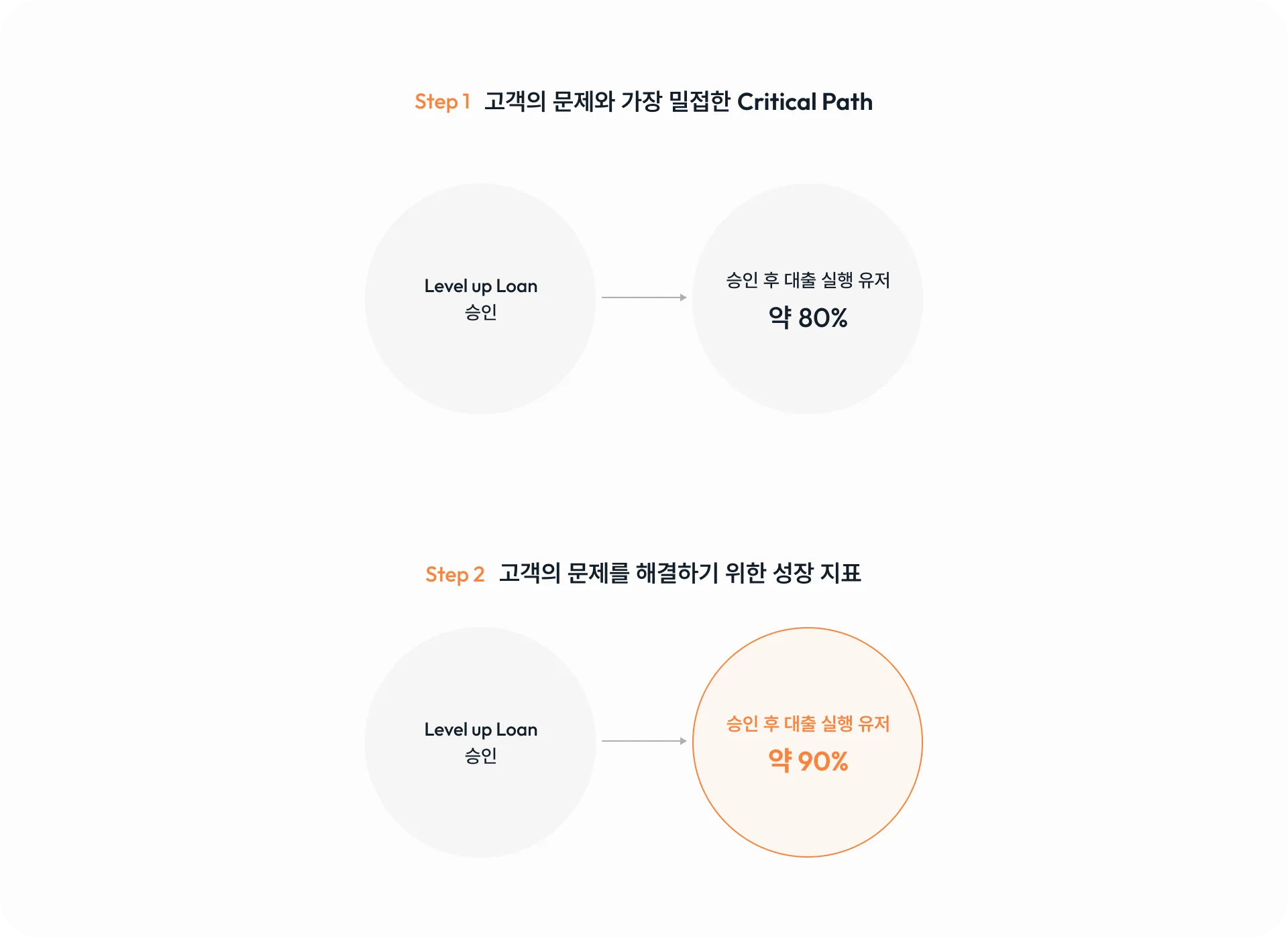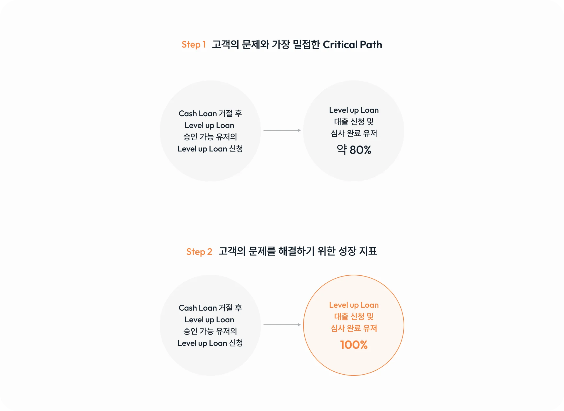 이와 같이 Critical Path를 설정한 후, 성장 지표를 정의했습니다. 더 나은 조건의 Cash Loan 대출이 승인될 수 있는 유저에게 Levelup Loan 승인 시점에 Cash Loan 승인 정보를 동시에 제공함으로, 승인 후 대츨 실행까지 가는 유저의 비중을 높이는 것이었습니다.