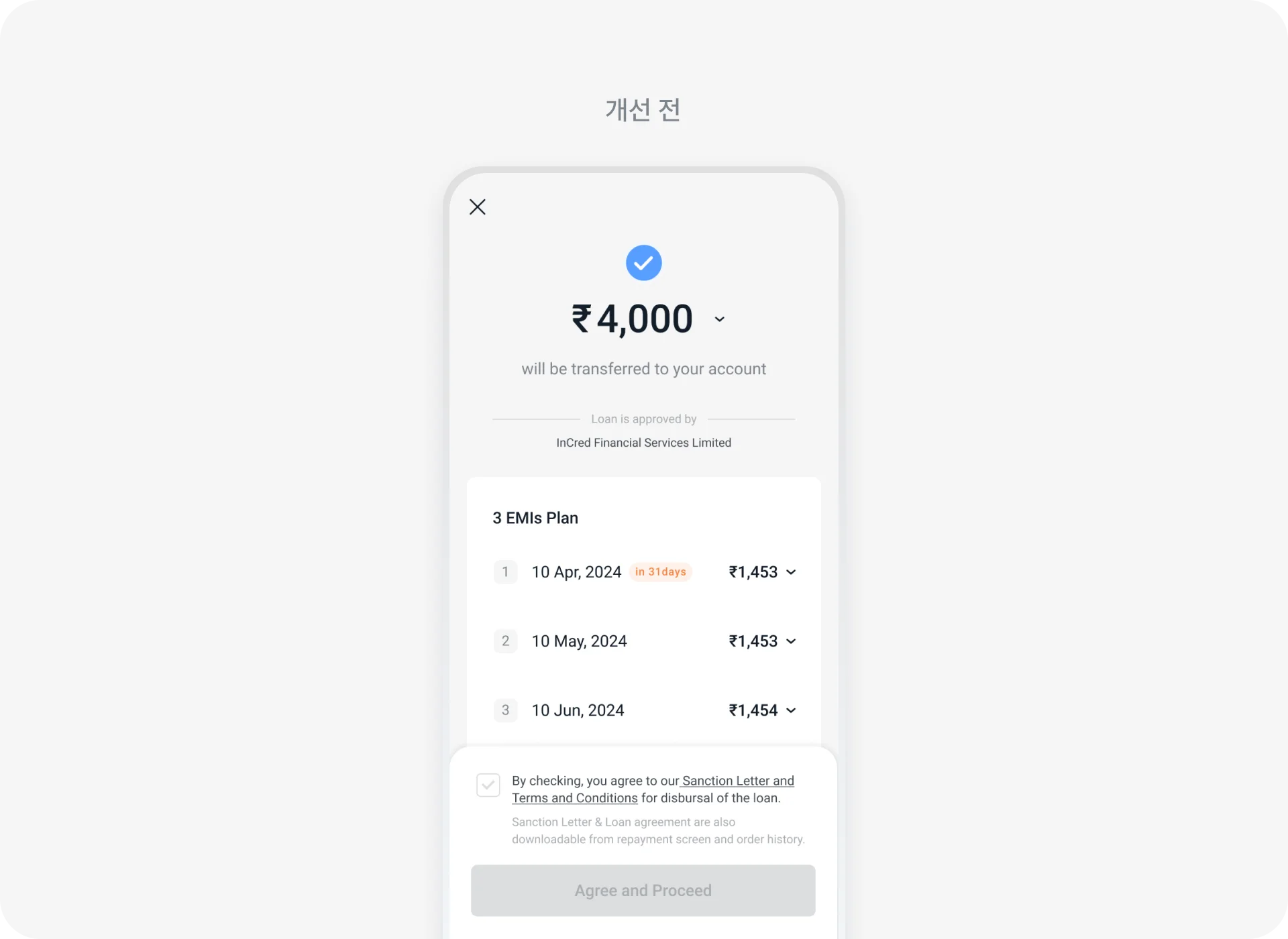 이와 같이 Critical Path를 설정한 후, 성장 지표를 정의했습니다. Levelup Loan의 승인 정보를 미리 제공함으로써, Levelup Loan도 거절될 것이라 생각해 신청 단계에서 이탈하던 유저가 Levelup Loan 신청 완료 후 승인까지 도달하도록 만드는 것이 목적이었습니다. 때문에 다음과 같은 목표 설정 이후 프로세스와 화면을 아래와 같이 Cash Loan 거절 시점에 Levelup Loan의 승인 여부를 알 수 있도록 개편했습니다.